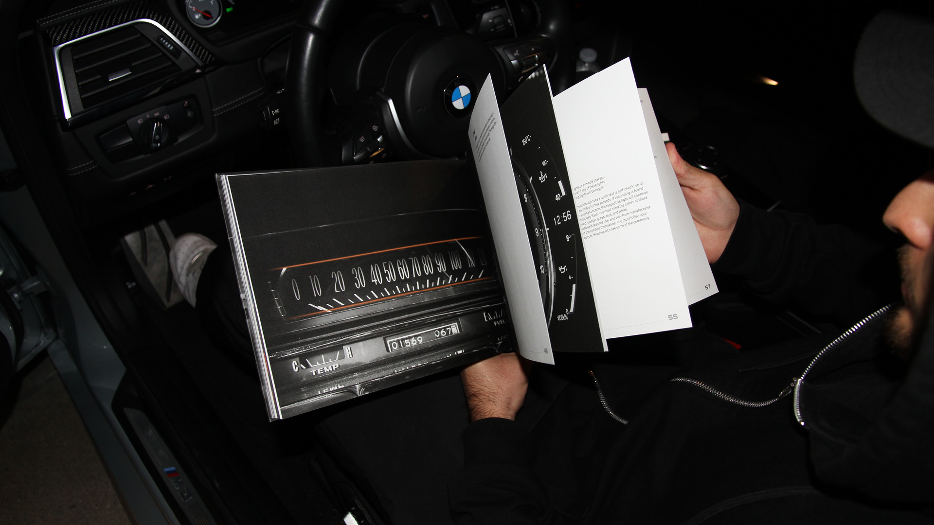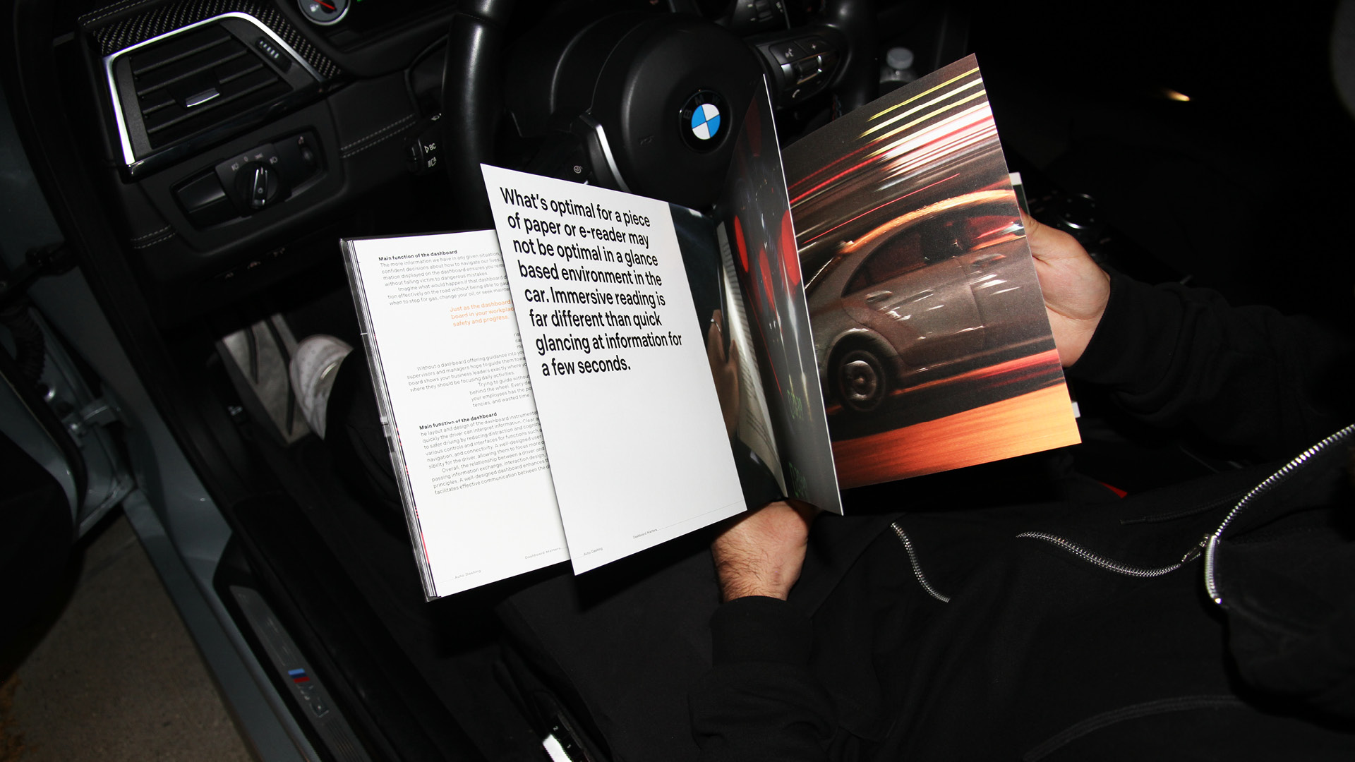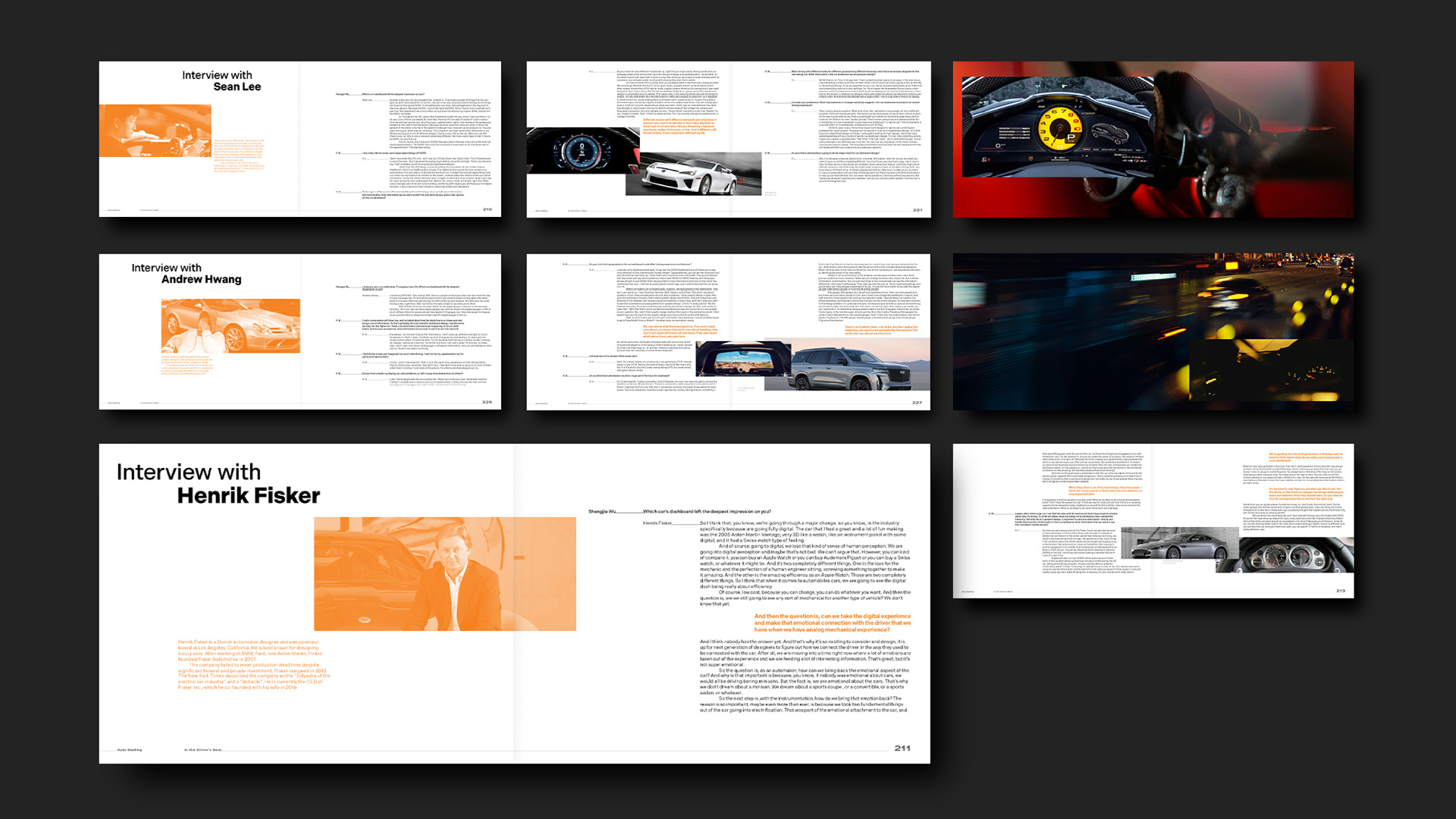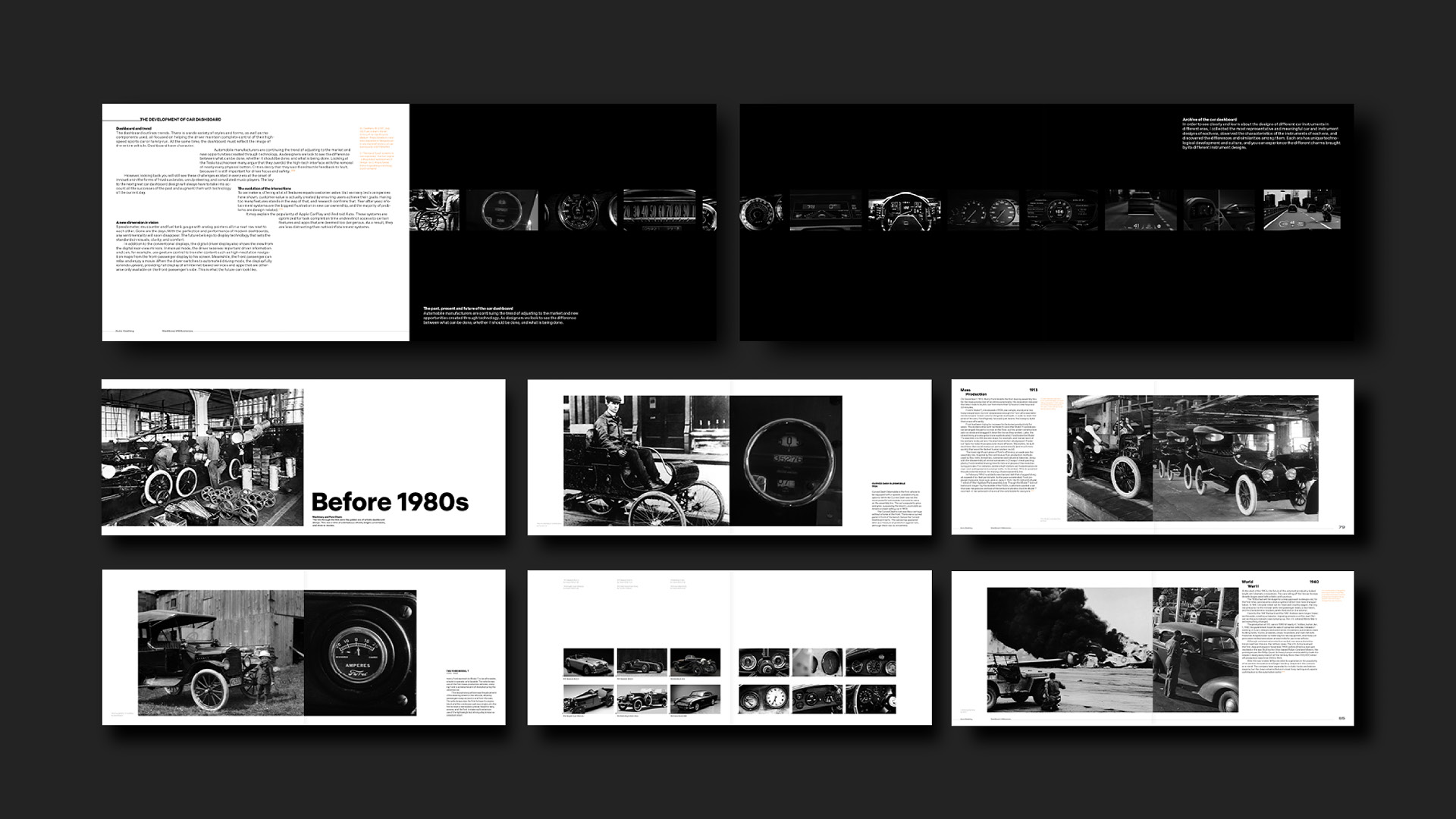 The introductory spread emphasizes the relationship between the car, the dashboard design, and the driver by using images of the car in action and dashboards. The black and white images communicate the feel and texture of a vehicle going at high speeds.