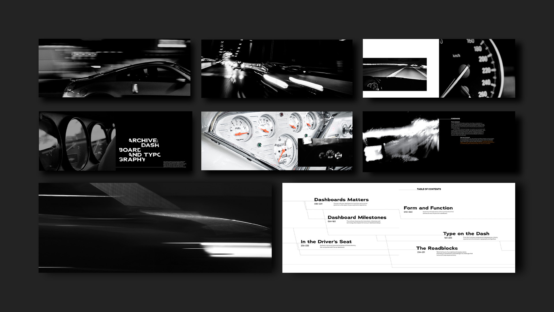 Speed-infused images, dashboards, and stacked typography are used throughout the book to create a high-speed driving environment.