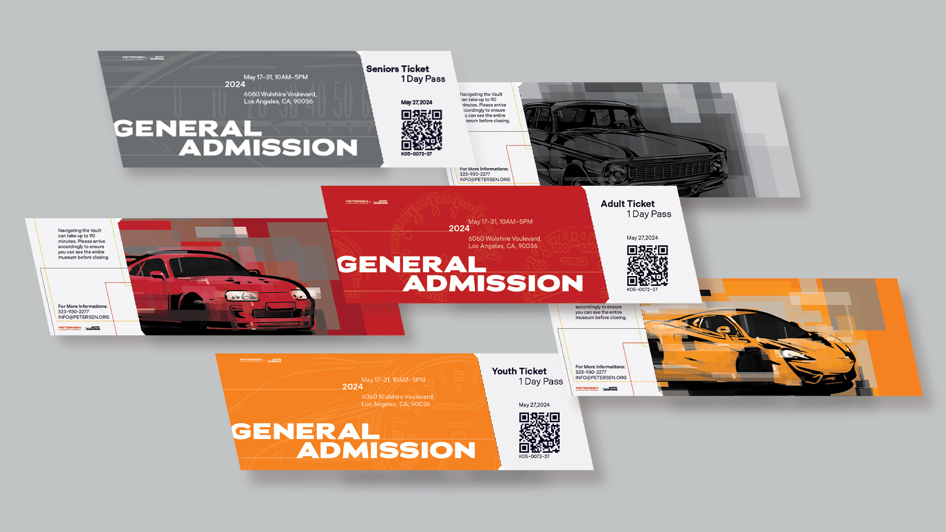 Tickets are designed in the shape of a dash. Illustrations of cars serve as the main image on the ticket to thematically link the brand with its subject while also demonstrating the inspiration for the logo.