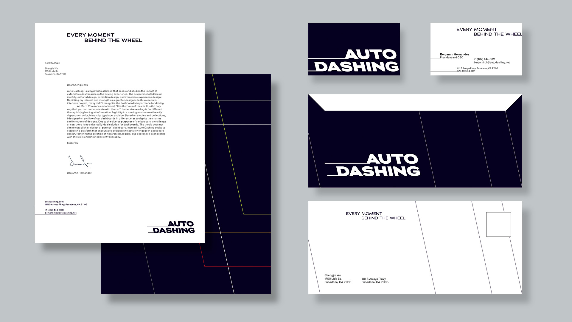 The primary logo was inspired by the sprinting effect of driving a car at night. It represents speed and driving conditions on the road, using a diagonal angle and extension line at the beginning of the letter to create a speedy atmosphere. This also represents the core purpose of Auto Dashing, which is to study the impact of car dashboard typography on the driver’s experience at high speeds.