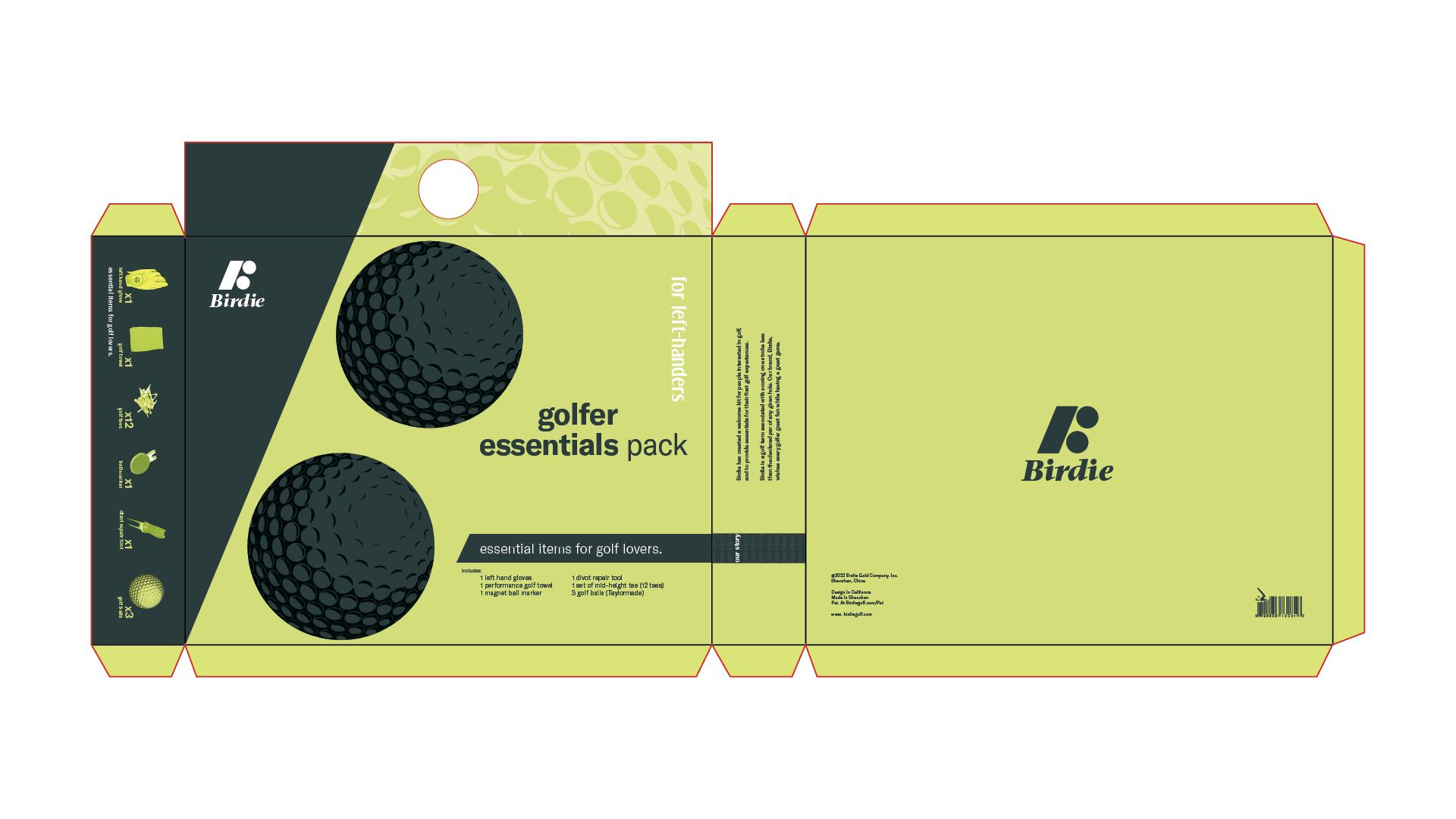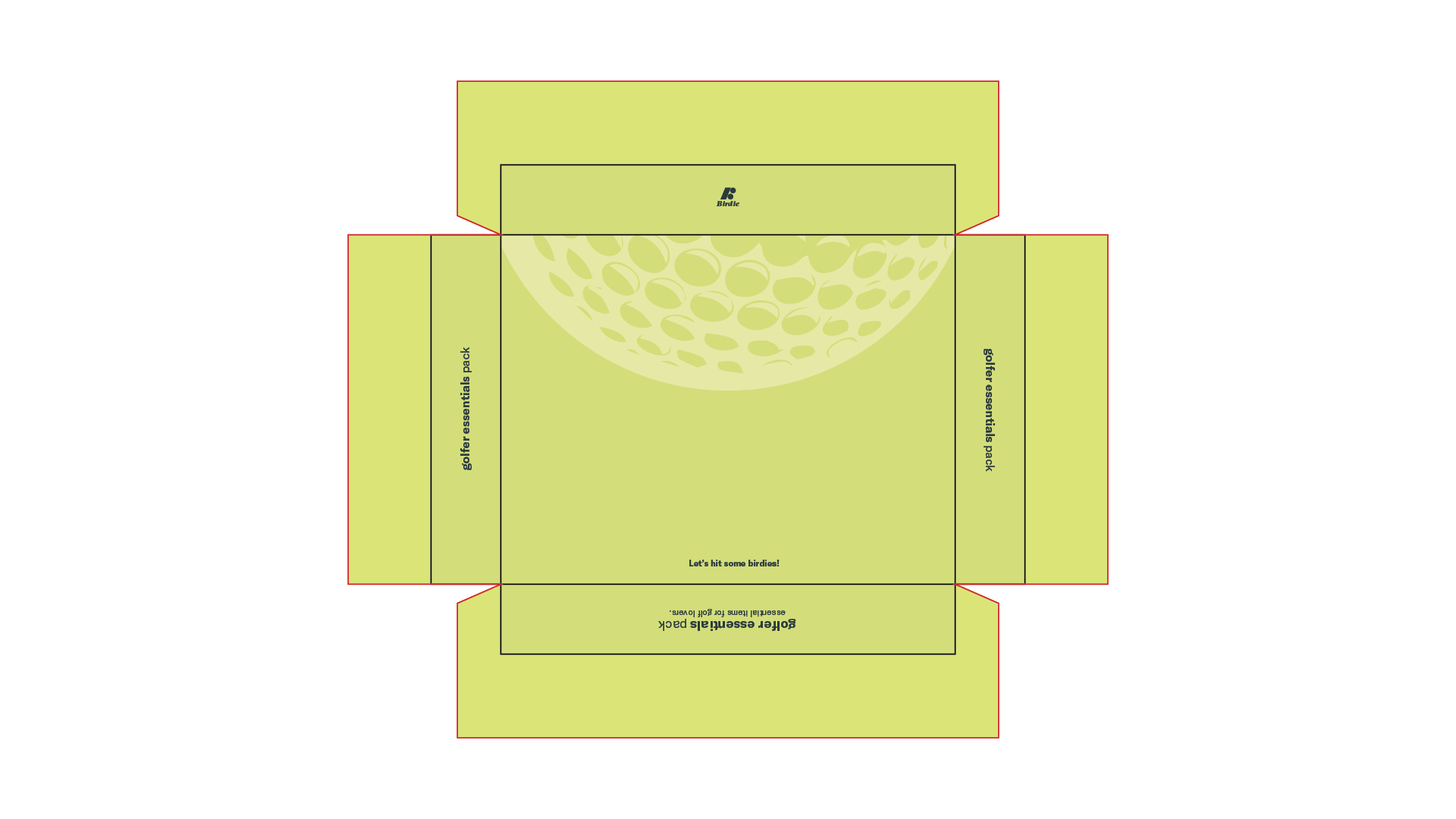 By designing a 2D graphic with die cuts, I saw how flat paper can be turned into a physical container. All graphic elements and designs are inspired by golf courses and golf. The use of green brings friendly and fresh attributes to the audience, and the use of golf texture to convey the concept of golf balls.