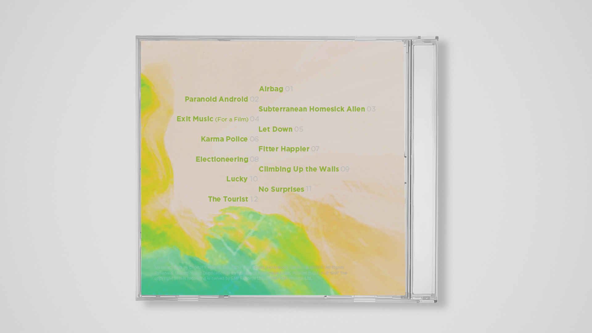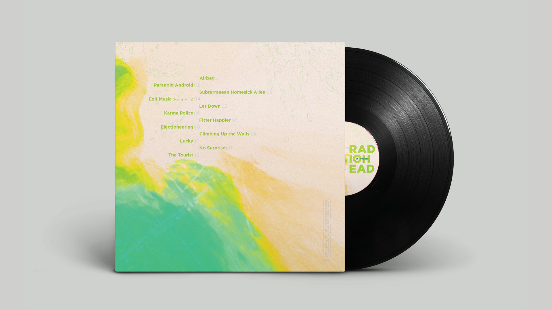 Isolation, alienation, anti-capitalism, and political corruption are all themes that Radiohead raises in OK Computer to predict what the 21st century would look like. I use the acid green color to visualize the emotional detachment.